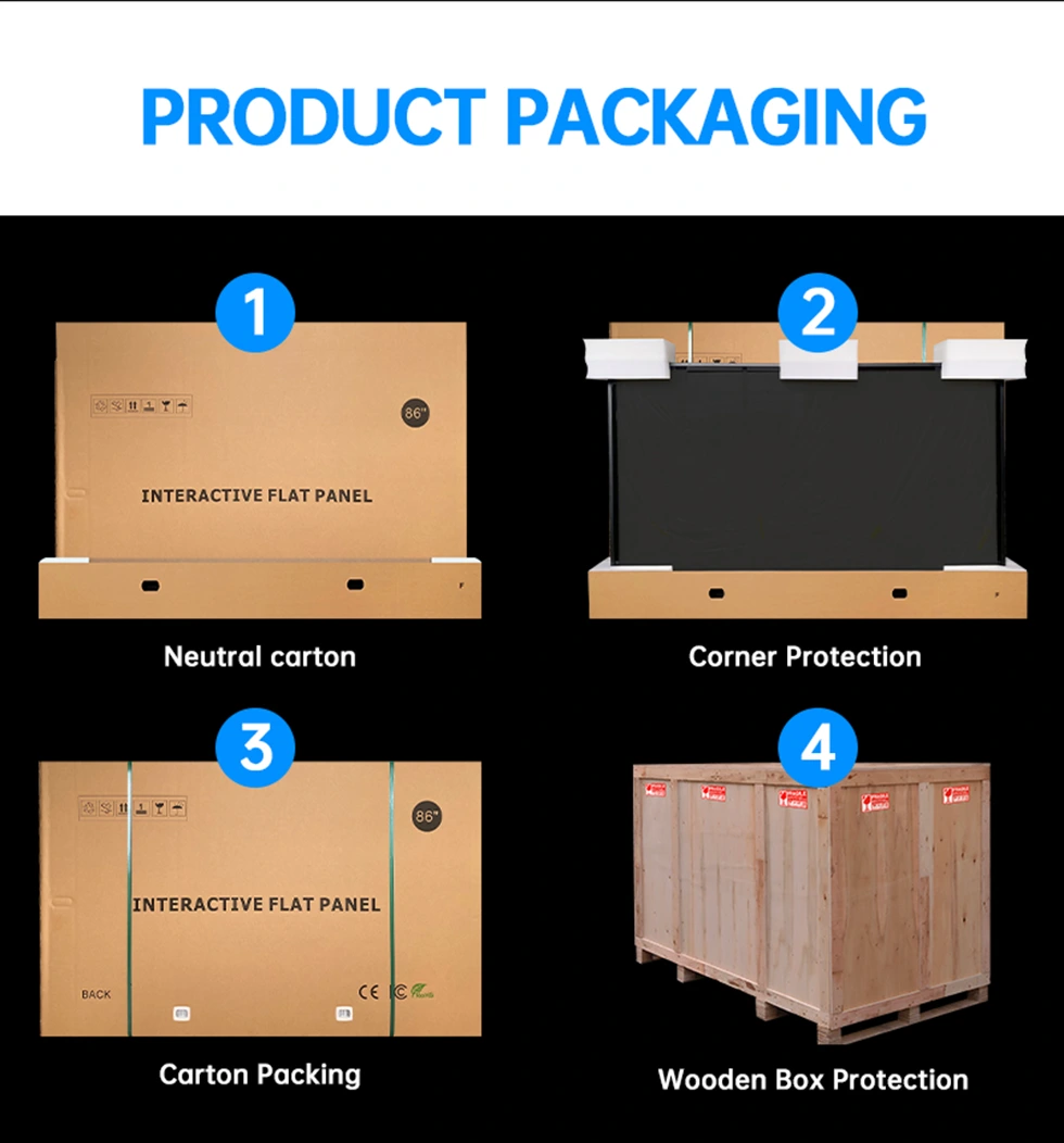 インタラクティブ フラット パネルは、安全に輸送できるように強化木箱保護付きの中性カートンにしっかりと梱包されています。