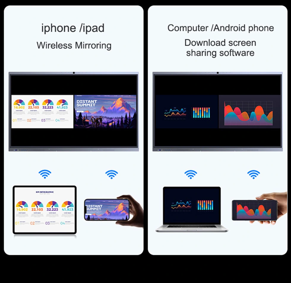 このケーブル不要のソリューションは、幅広いデバイス互換性と鮮明な同期投影を提供します。インタラクティブなリバースコントロールを備えたマルチユーザー画面共有が可能になり、ビデオ、音楽、ドキュメントをシームレスに共有できます。